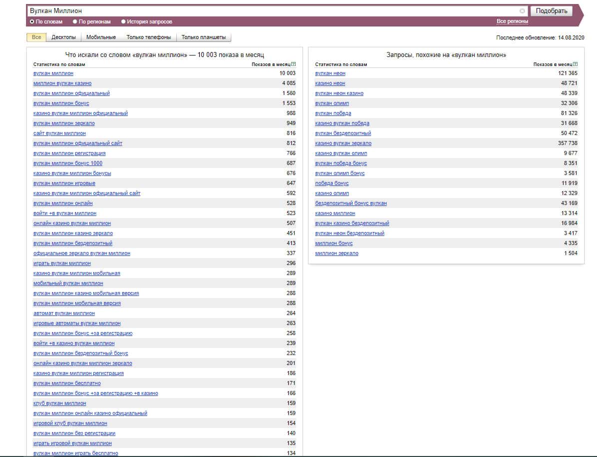 Название бренда "Вулкан Миллион" на русском языке люди искали в системе Яндекс 10 003 раза.