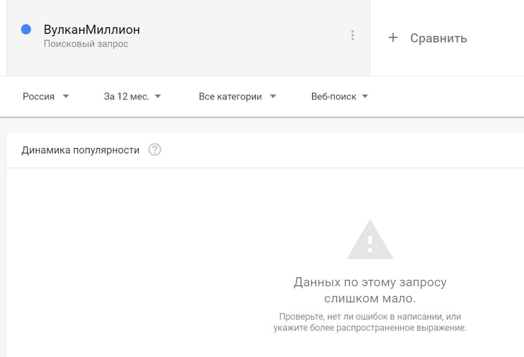 Название бренда "ВулканМиллион" на русском языке без пробела пользователи практически не искали в системе Гугл.