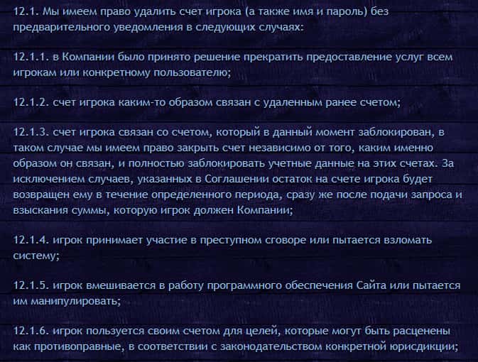Контора Вулкан Платинум имеет право удалить счет клиента по множеству причин и без предварительного уведомления пострадавшего игрока.