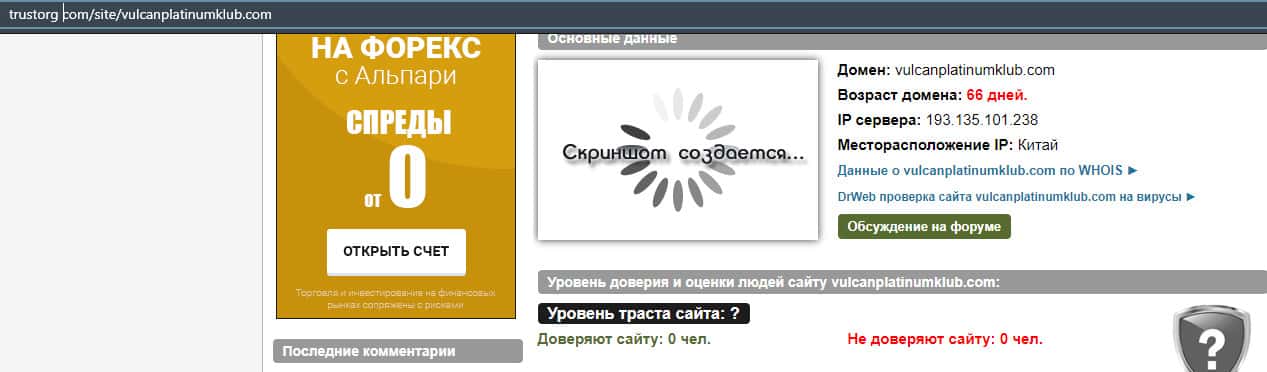 Далее вы можете ознакомиться с возрастом домена сайта мошенников Vulcan Platinum. На момент написании материала он составляет 66 дней, потому что это казино-однодневка.