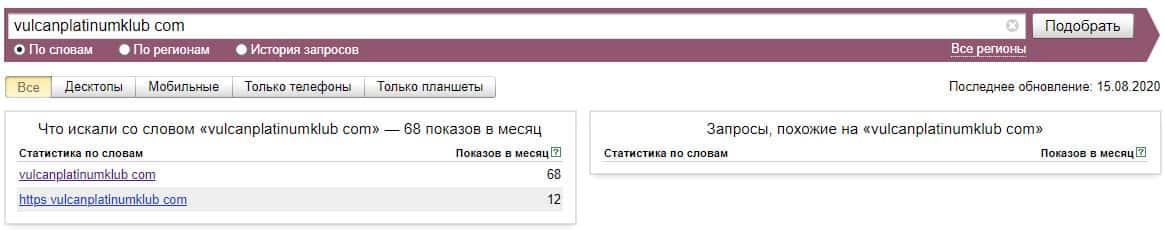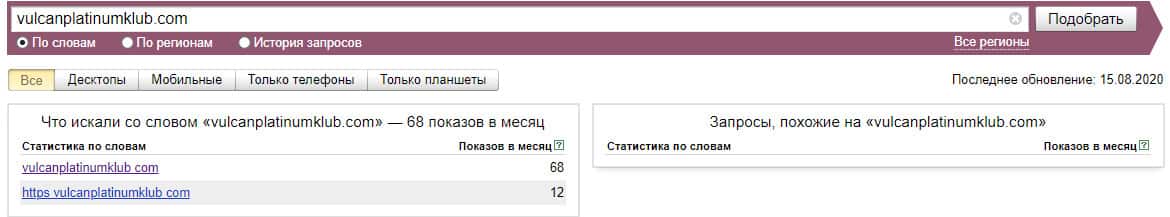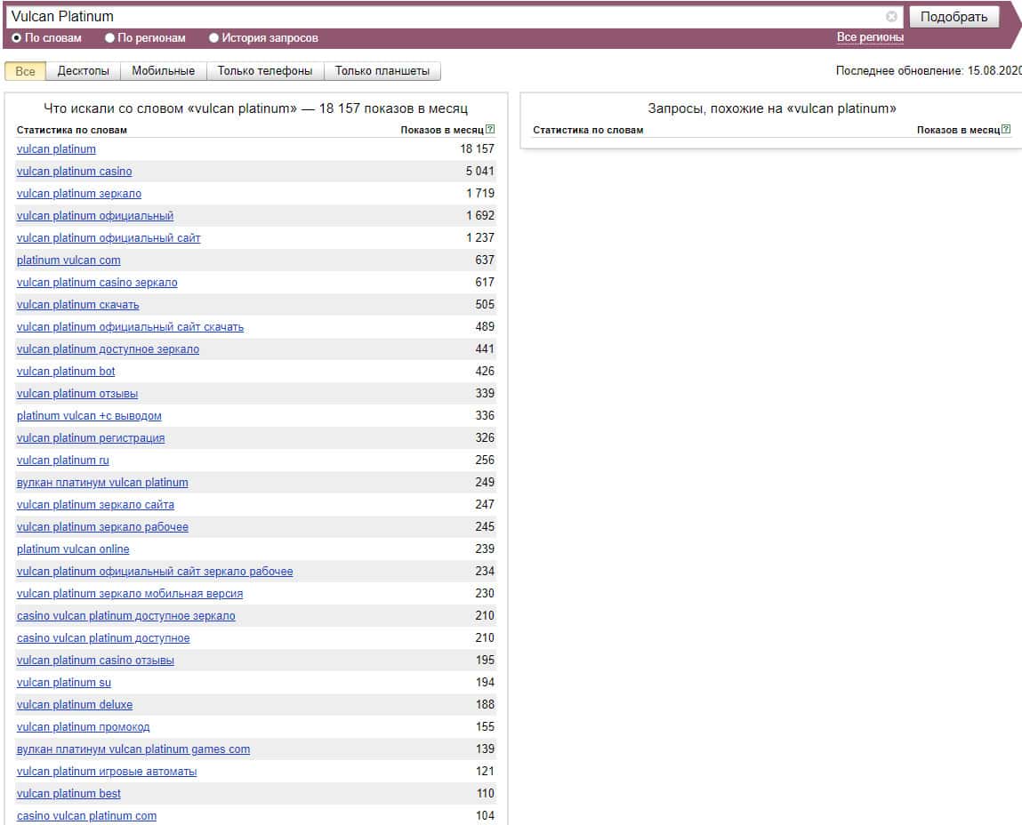 Касательно англоязычного бренда в данной вариации "VulcanPlatinum", контора по Яндекс Вордстат набрала свыше 10 000 показов, что является намного ниже показателями.
