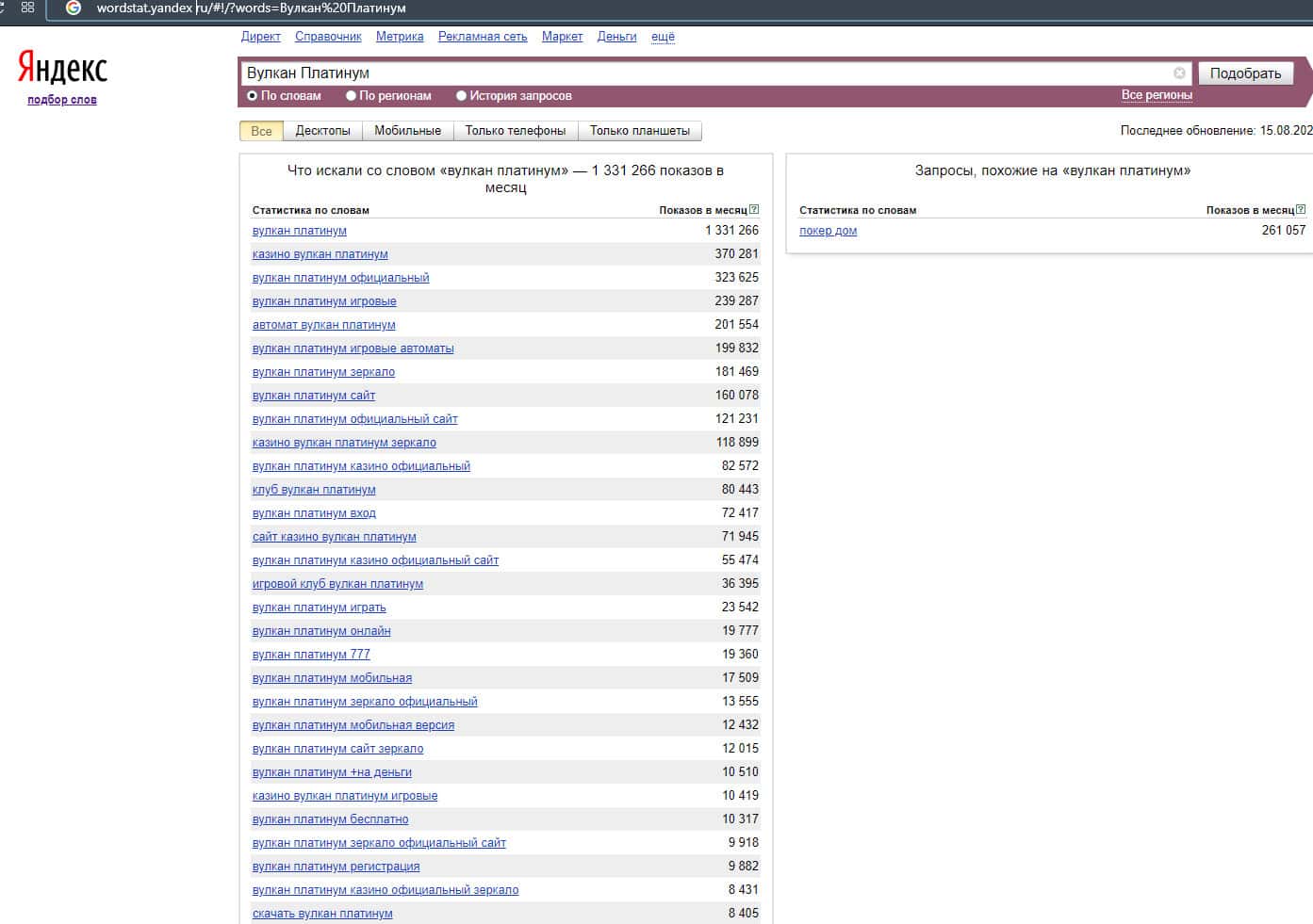 Чтобы проверить популярность конторы, мы решили проверить ее бренды на запросы в поисковой системе Яндекс. Бренд "Вулкан Платинум" был найден 1331266 раз за месяц.