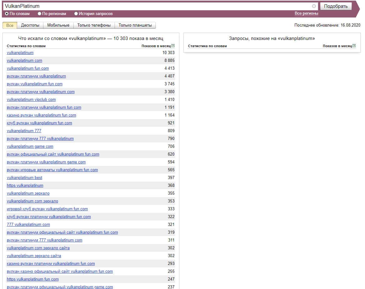 По поводу запроса "ВулканПлатинум", мошенническая организация запрашивалась 55 раз по статистике системы Яндекс.Вордстат.
