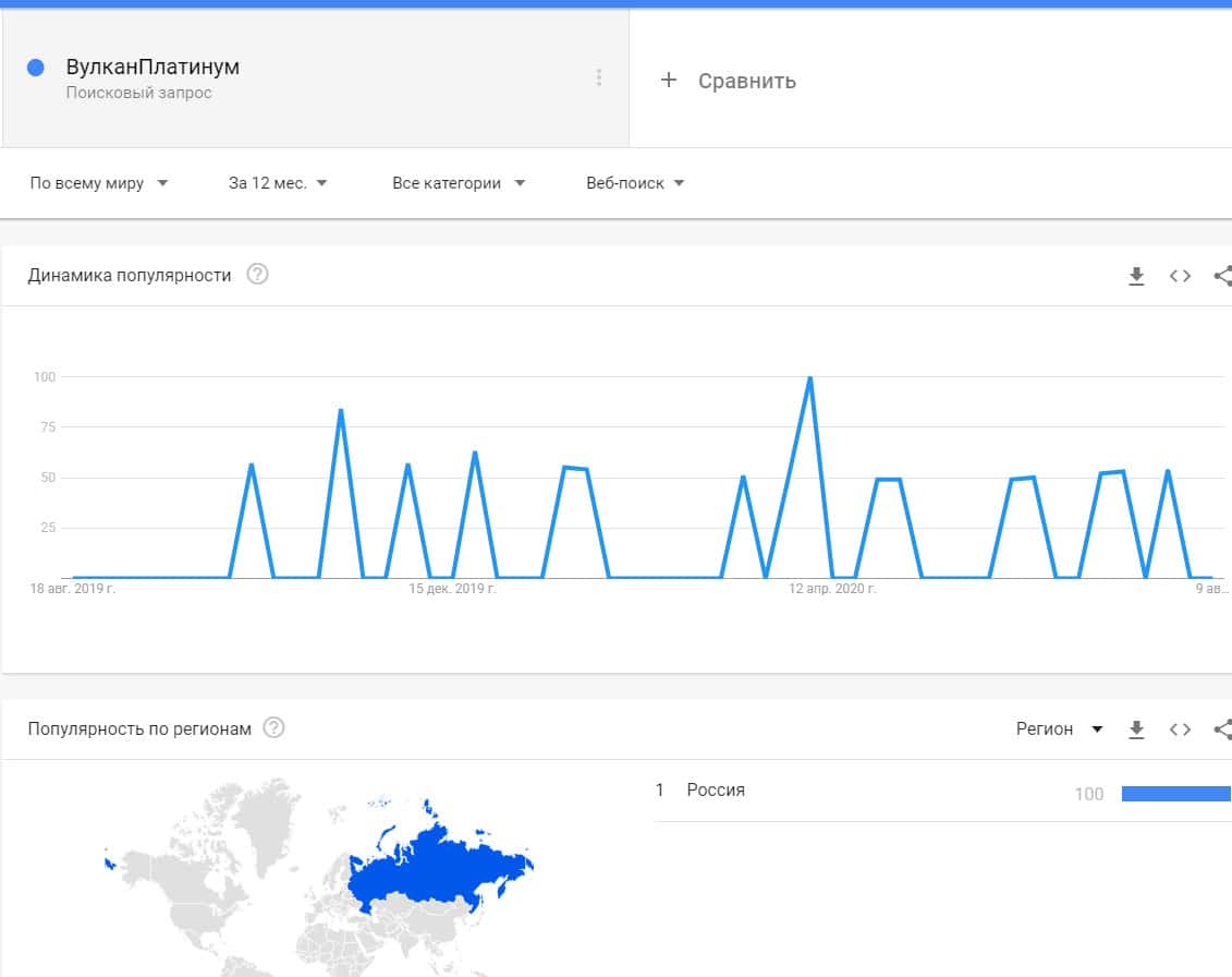 Касательно бренда "VulcanPlatinum" по Гугл Трендс и сказать нечего, так как мошенническая организация не была запрошена ни разу.
