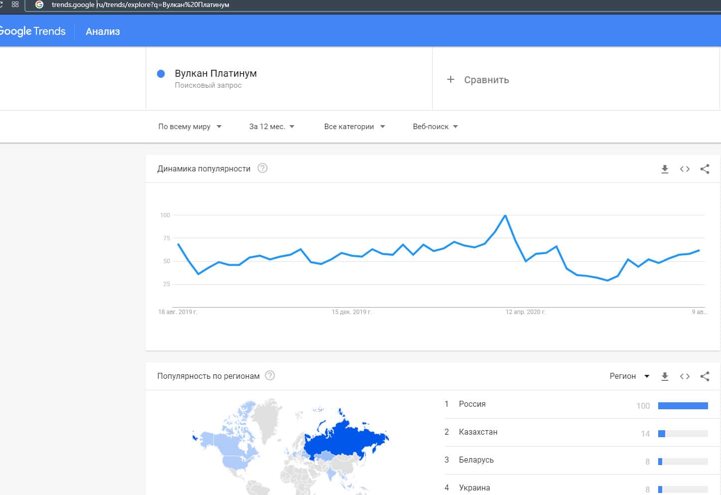 Бренд "Вулкан Платинум" по запросам набрал огромное количество запросов в Гугл и в основном эти запросы шли с России, Казахстана, Беларуси и Украины.