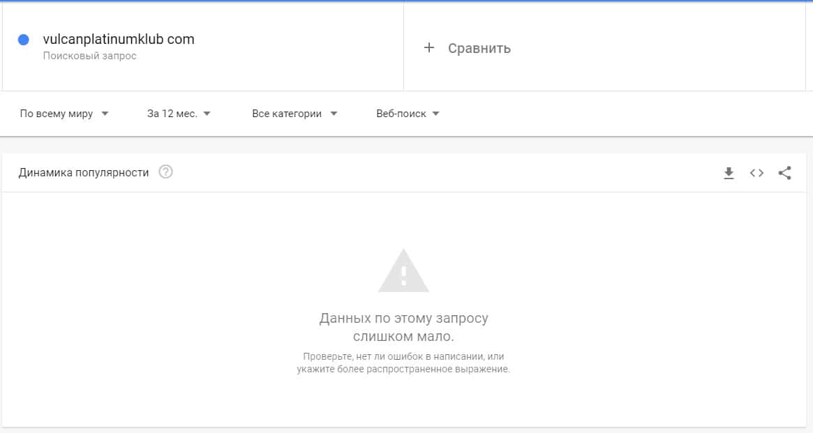 Бренд с пробелом "vulcanplatinumklub com" не имеют запросов в поисковой системе Гугл вообще, и это значит, что компания не популярна.