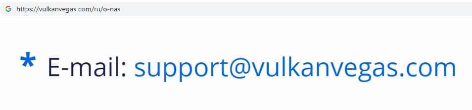 Лохотронщики Вулкан Вегас на своем официальном онлайн-ресурсе указывают адрес электронной почты, а именно: