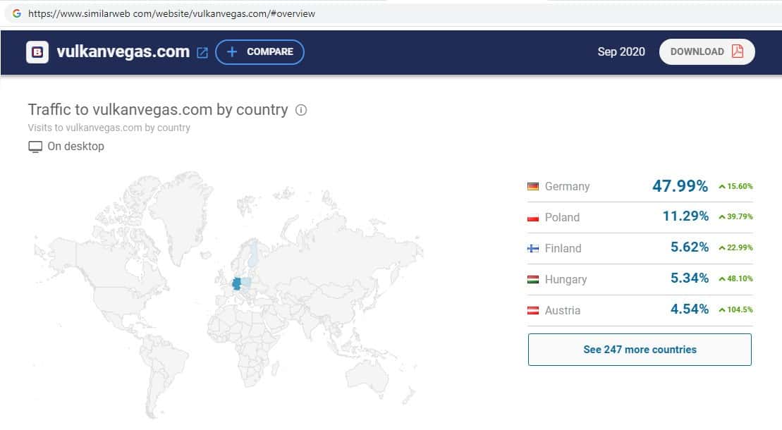 При проверке посещаемости веб-ресурса скам-организации Вулкан Вегас на similarweb com оказалось, что среди трафика есть пользователи из Германии, а также Польши.