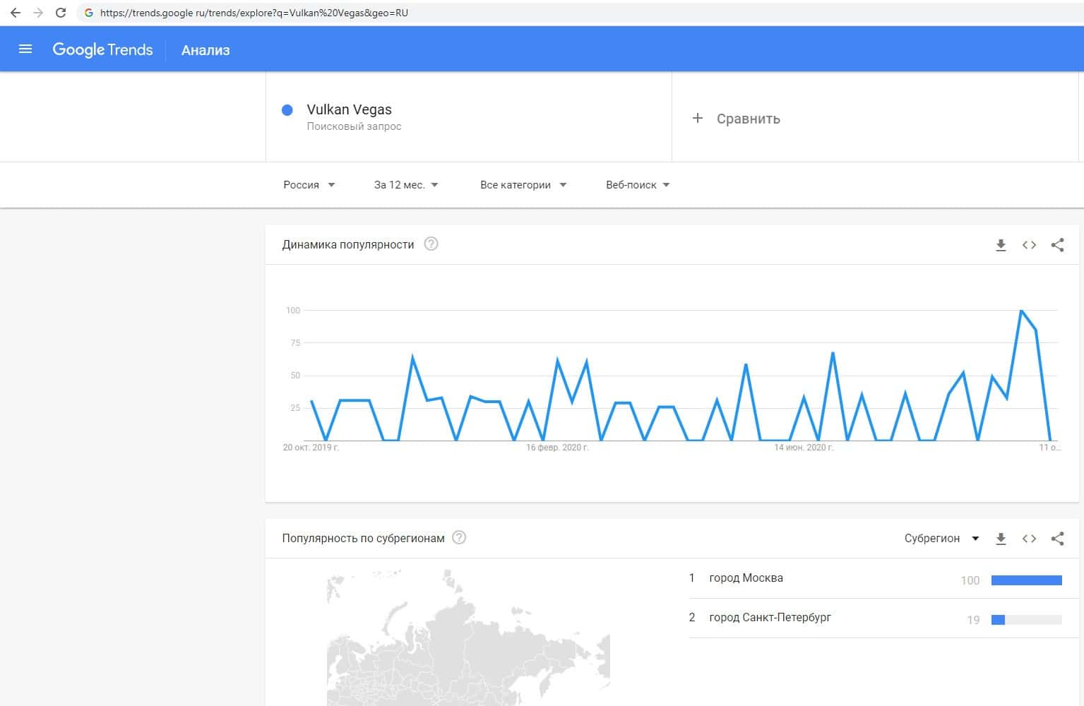 По количеству брендовых запросов англоязычного названия компании без пробела "VulkanVegas" на Трендс Гугл Ру также есть информация.