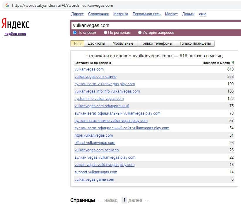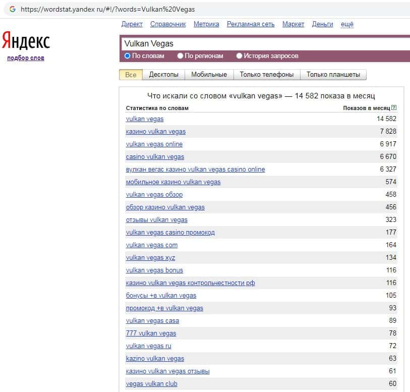Данный интернет-лохотрон под названием "Вулкан Вегас" вероятнее всего пользуется популярностью на wordstat yandex ru из-за рекламы в интернете.