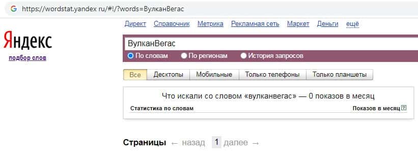 Количество брендовых запросов названия компании на русском языке без пробела "ВулканВегас" на wordstat yandex ru вероятно равно нулю.