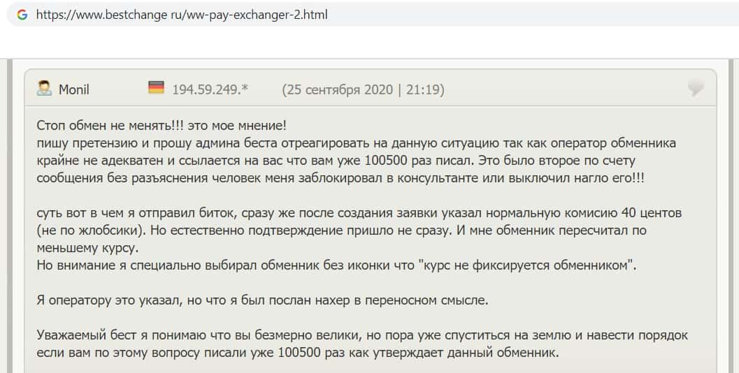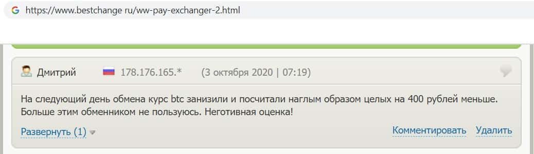 Ещё один пользователь поделился своим опытом сотрудничества с WW Pay. Он рассказал, что решил воспользоваться услугами компании, но его так же нагло обманули с курсом.
