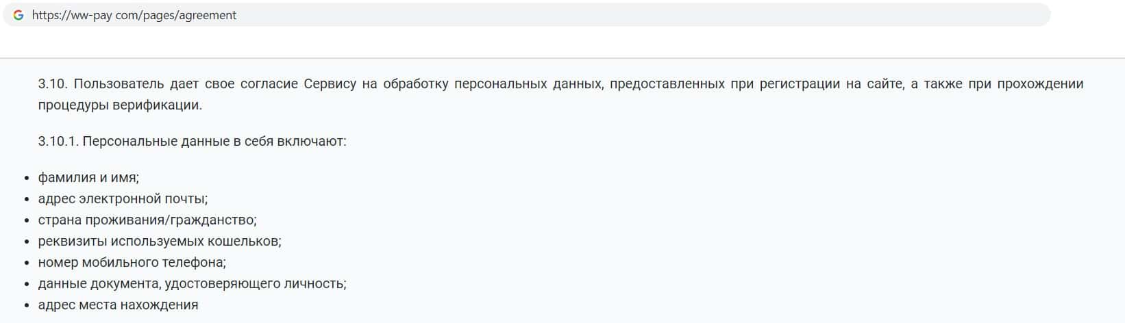 Так же компания WW Pay указала, что пользователь должен предоставить фирме свои личные данные, которые компания в последствии сливает другим мошенническим фирмам.