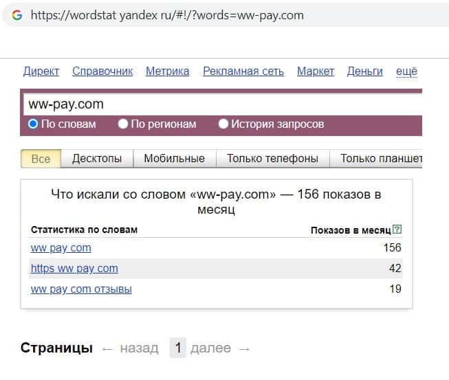 Мы проверили количество запросов компании мошенников WW Pay в Яндексе по названию фирмы, а именно "WW Pay". 531 раз пользователи совершили данный запрос за месяц.
