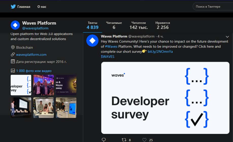 Имеется у аферистов Waves Platform и страница в социальной сети Twitter, где мошенники Вейвс Платформ накрутили себе более сотни тысяч подписчиков, однако и активности на их аккаунте в Твиттере крайне мало. На изображении, расположенном ниже, вы можете наглядно увидеть внешний вид страницы лохотрона Waves Platform в Twitter.