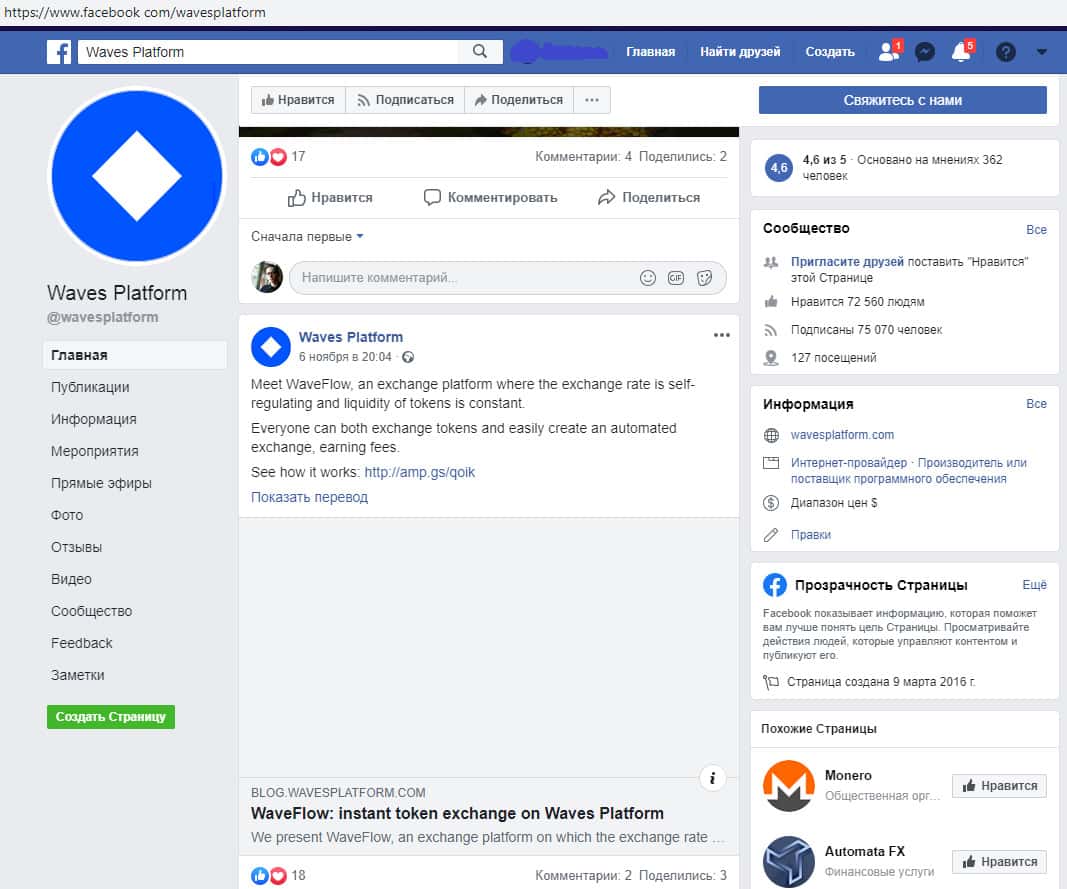 Дабы соответствовать современным трендам жулики Waves Platform обзавелись страницами в социальных сетях, одной из которых стал Facebook, где у шулеров Вейвс Платформ имеется более полусотни тысяч накрученных подписчиков, однако никакой активности на сайте у жуликов Waves Platform не наблюдается.