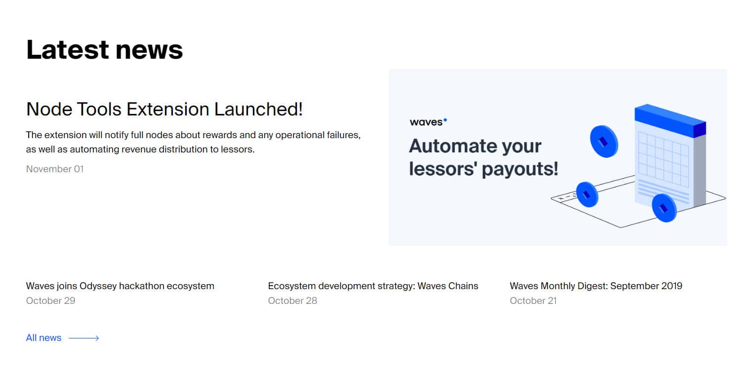 После на сайте у проходимцев Вейвс Платформ следует довольно стандартный и ожидаемый раздел с новостями, с помощью которого аферисты Waves Platform хотят показать наивным пользователям сети что жулье Вейвс Платформ реально ведет какую-то торговую деятельность. На изображении ниже вы можете увидеть данный раздел сайта.