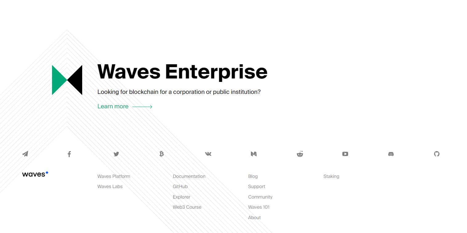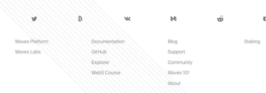 Завершается же сайт у лохотрона Вейвс Платформ довольно стандартно и ожидаемо, а именно типичным меню со ссылками на различные разделы подвального сайта аферистов Waves Platform, а так же ссылками на страницы аферистов Вейвс Платформ в социальных сетях. На изображении, расположенном ниже, вы можете увидеть окончание сайта.