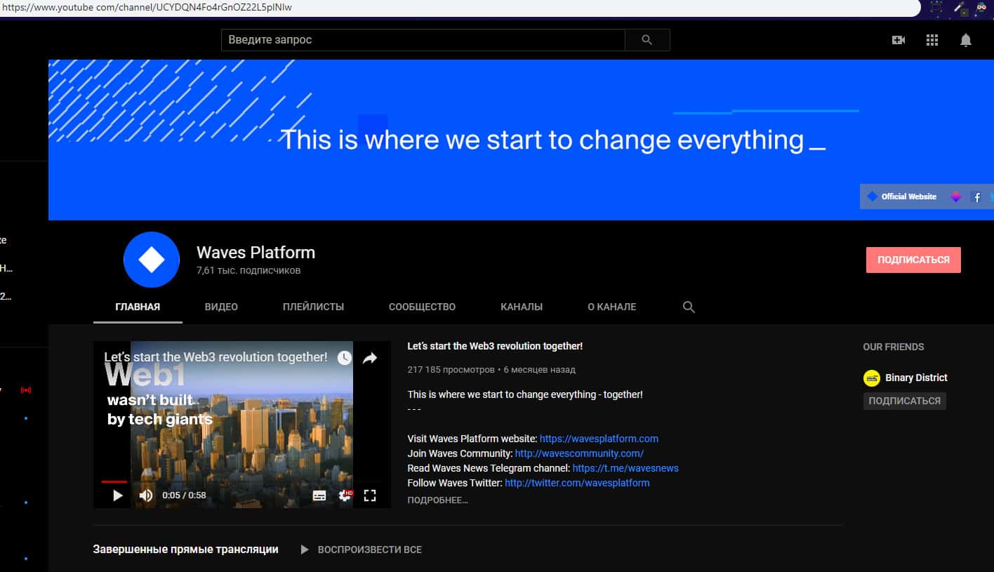 Для размещения различных рекламных видеороликов с лапшой на уши наивной клиентуре аферисты Waves Platform обзавелись страницей в социальной сети YouTube, где у жулья Вайвс Платформ имеется всего-лишь несколько тысяч подписчиков. На изображении, расположенном ниже, вы можете увидеть страницу лохотрона Waves Platform в Ютубе.