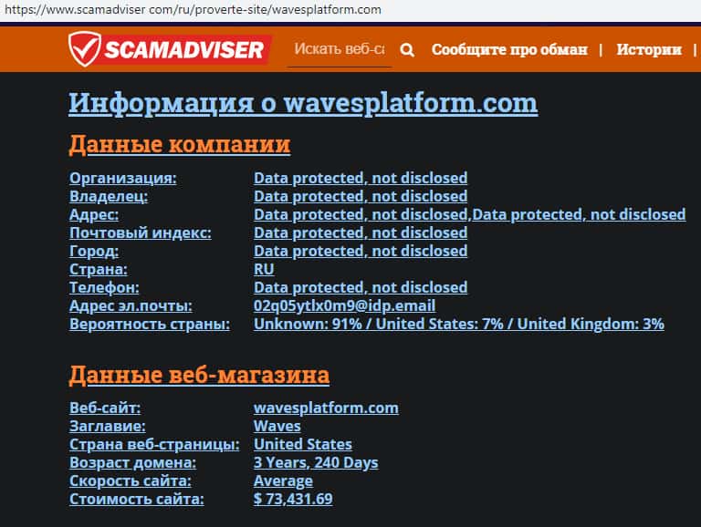 В связи с мошеннической и противозаконной деятельностью лохотрона Вейвс Платформ его реальные руководители предпочитают анонимность дабы избежать ответственности со стороны правоохранительных органов. Техническую же информацию о сайте мошенников Waves Platform можно узнать с помощью портала scamadviser com.