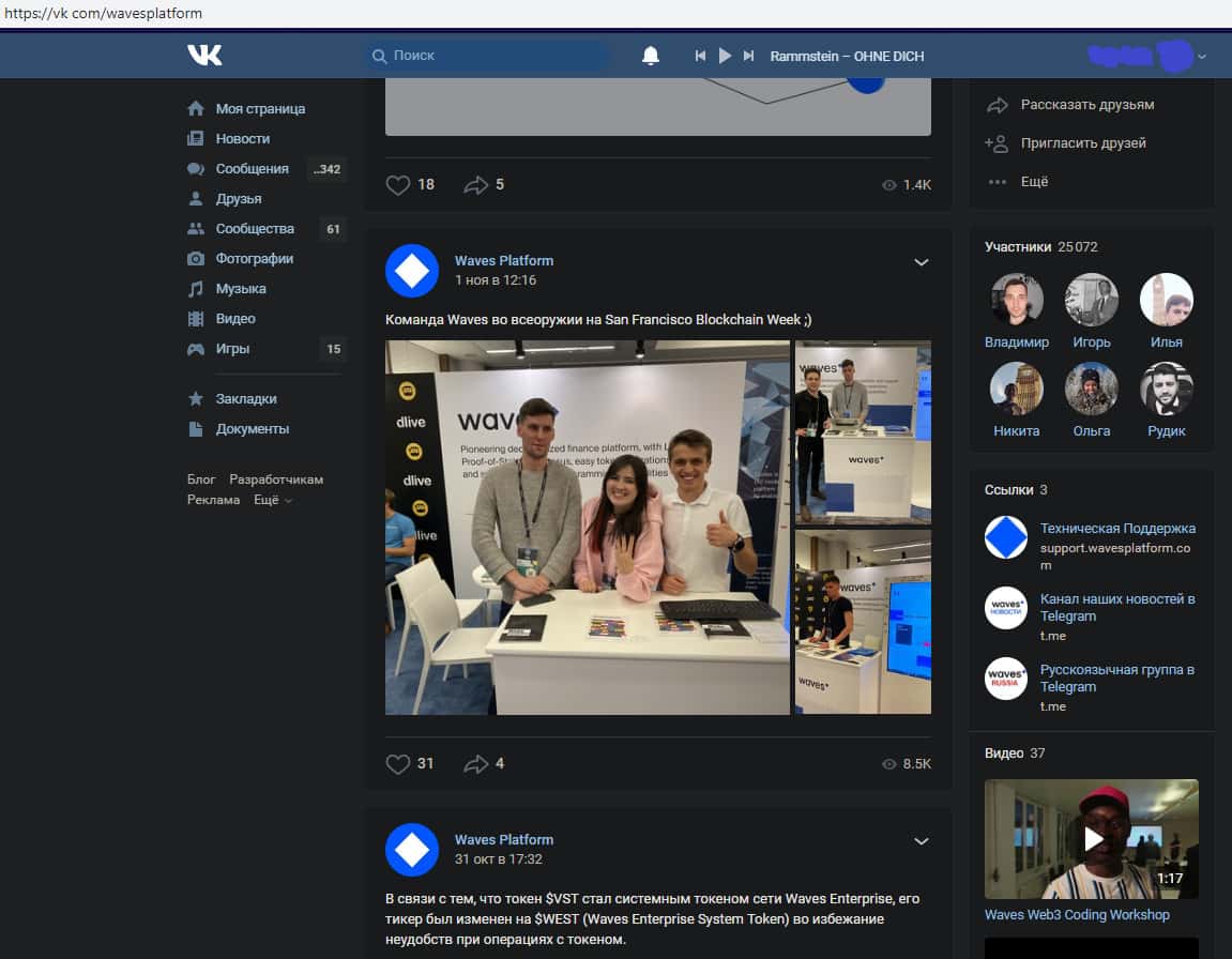 Так же имеется у аферистов Waves Platform и страница в социальной сети вконтакте, где мошенники Вейвс Платформ накрутили несколько десятков подписчиков, однако самой активности на аккаунте у жуликов Waves Platform не наблюдается. На изображении, расположенном ниже, вы можете увидеть страницу мошенников в Вконтакте.