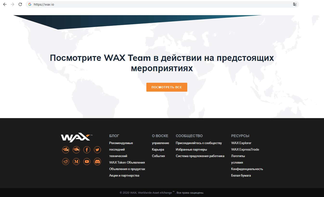 Завершает мошеннический интернет ресурс компании WAX io раздел с ссылками на фейковую документацию компании и действиях WAX Team на предстоящих мероприятиях. Как и ожидалось на сайте нет никакой полезной информации, сплошная ложь и расхваливание компании самой себя. Обычный сайт сделанный в кустарных условиях.