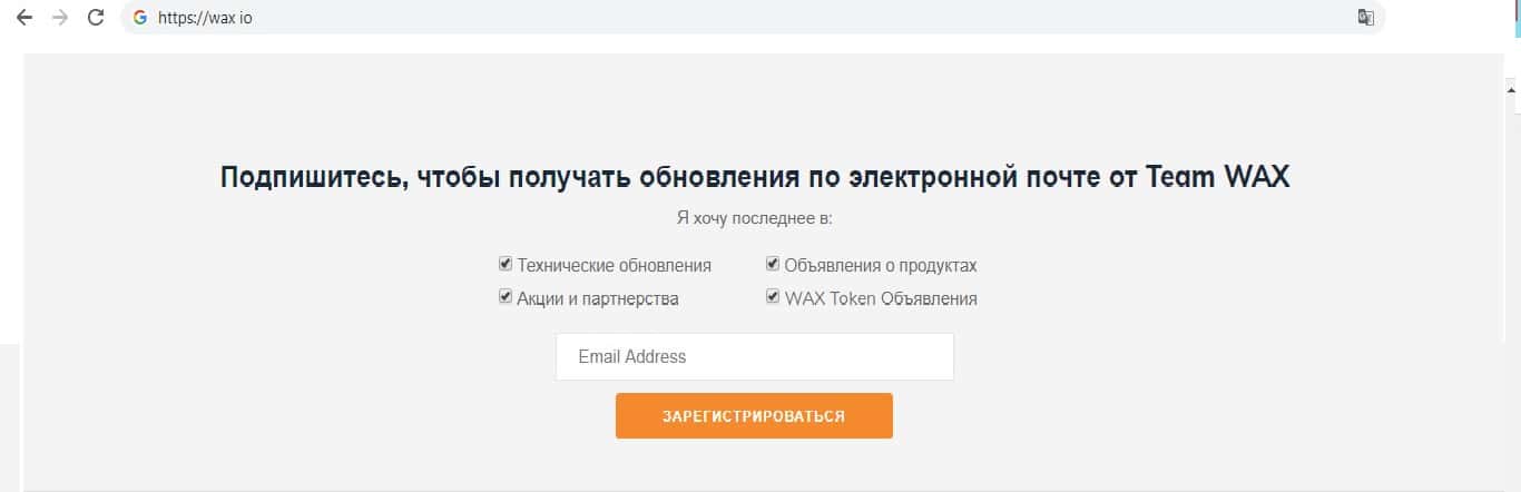 В следующем пункте аферисты ВАКС Ио призывают клиентов подписаться на обновления компании и получать о них информацию по электронной почте. Жулики предлагают рассылать информацию о технических обновлениях, о акциях и партнёрствах, так же о обновлениях WAX Token и объявлениях о продукта.