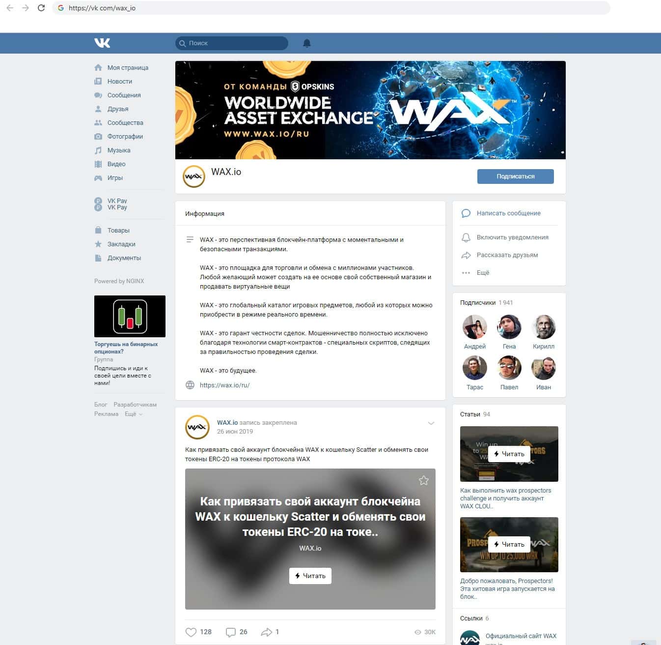 Мошенники WAX io завели страницу в Вконтакте. Там жулики набрали почти 2000 подписчиков, и промывают им мозги о том, что бы сотрудничать с мошеннической компанией. Им это хорошо удаётся, так как много геймеров хотят приобрести или продать виртуальные предметы, но в итоге только теряют деньги в компании разводил.