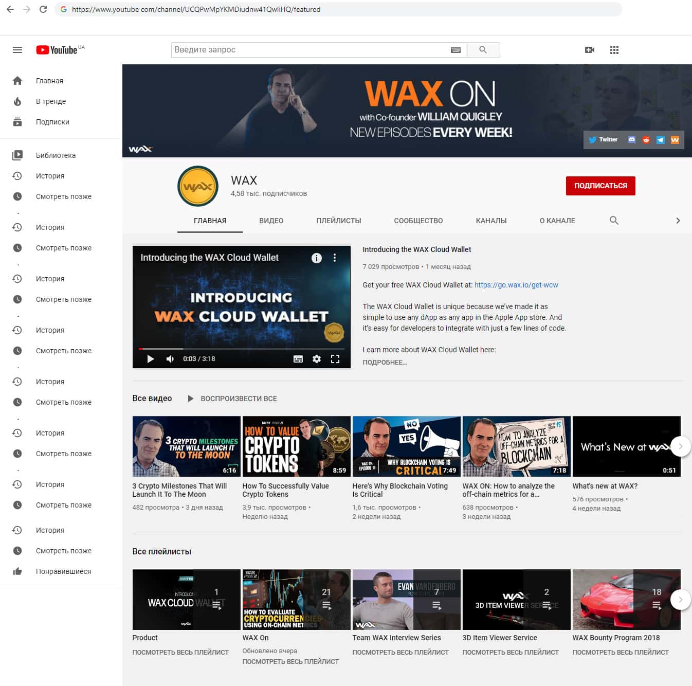 На всемирно известном видеохостинге YouTube так же был создан канал махинаторов WAX io. Там разводилы публикуют свои смонтированные видеозаписи, где рассказывают и показывают клиентам как взаимодействовать с конторой. Аферисты стараются найти подход к пользователям с любой стороны, лишь бы повлиять на них и заставить вкладывать деньги.