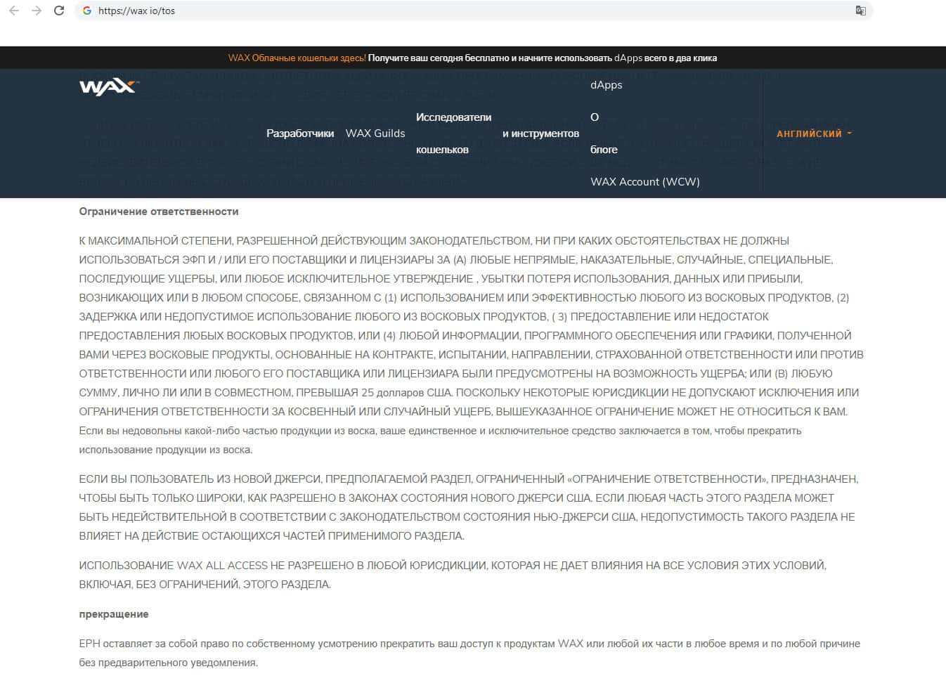 Так же аферисты предоставили предупреждения о рисках. В них компания снимает с себя всю ответственность, и перебрасывает её на плечи клиентов. Так же компания мошенников WAX io указывает то, что имеет полное право в одностороннем порядке прекратить сотрудничество не оповещая при этом вторую сторону.