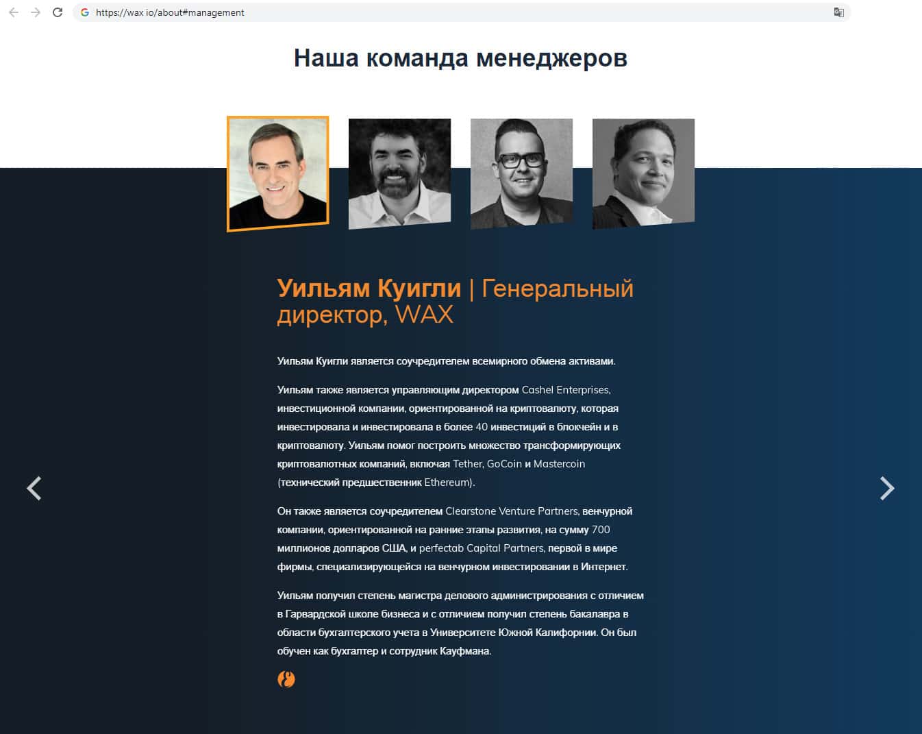 Мошенническая организация ВАКС Ио предоставила информацию о руководстве. Жулики не скрывают своё руководство, но с другой стороны мошенники могут указать просто имена и фамилии посторонних людей, так же фото которые указаны на сайте могут принадлежать другим людям, которые понятия не имеют, что их фото используют аферисты.