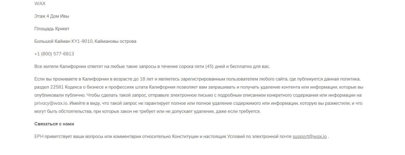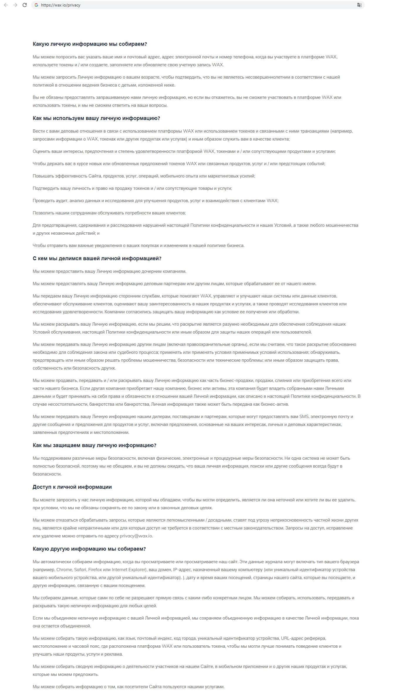 Махинаторы WAX io предоставили свою политику конфиденциальности. В ней они рассказали какую информацию они собирают, способы защиты этой информации. Но не стоит предоставлять мошенникам свои личные данные, так как это может сыграть с вами злую шутку. Жулики могут воспользоваться ими в своих личных целях.