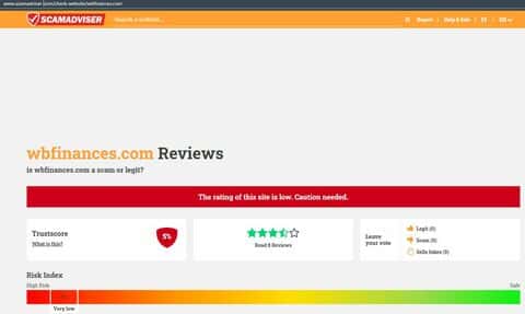По поводу сайта WBFinances также есть информация с сервиса scamadviser com. Их сайт полон ошибок, поэтому они имеют очень низкий рейтинг и люди попросту не доверяют им.