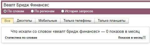 В поисковой системе Гугл бренд "Веалт Бридж Финансес" за месяц не был запрошен ни разу, поэтому и нет никакой статистики. Так что не ведитесь на этот гнусный лохотрон.