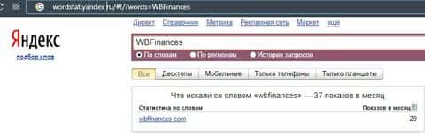 По версии запросов бренда "WBFinances" в поисковой системе Яндекс контора не очень популярна, поэтому набрала 37 показов за последний месяц.