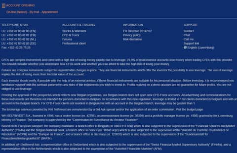 Для обеспечения дополнительного авторитета и серьезности шулера ВН Селф Инвест заявляют о лицензии в начале сайта, а подробнее о ней можно узнать из предупреждений о рисках в конце сайта аферистов WH Selfinvest, в которых жулики ВН Селф Инвест рассказывают об органах, которые их якобы регулируют, или же выдали шулерам лицензию.