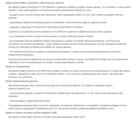Завершается политика конфиденциальности у аферистов WH Selfinvest разделами о наличии у вас определенных прав, на основе которых вы можете контролировать действия шулеров ВН Селф Инвест по отношению к вашей информации. Однако это скорее всего самопиар мошенников WH Selfinvest, чем реальный рычаг давления клиентов жуликов ВН Селф Инвест.