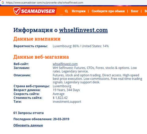 В связи со своей мошеннической и противозаконной деятельность руководители мошенников WH Selfinvest скрывают свои реальные личные и персональные данные, а так же контакты с целью избежания ответственности за свои многочисленные разводы пользователей. На изображении ниже вы можете увидеть информацию об аферистах ВН Селф Инвест с сайта scamadviser com.