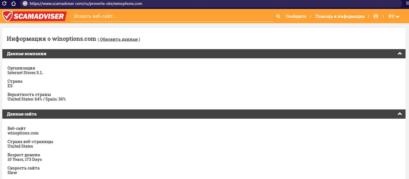 scamadviser com - сайт с технической информацией о жуликах Вин Опцион