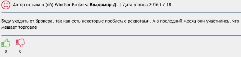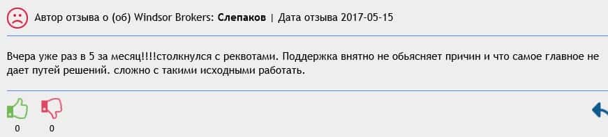 Клиент компании Windsor Brokers на портале ratingfx сом, оставил негативный отзыв о невозможности совместной торговли с этим форекс брокером, в связи с участившимися проблемами с реквотами.