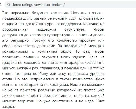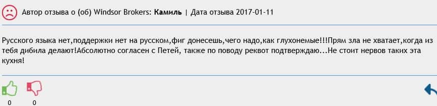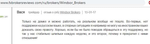 Трейдер Вася на странице веб-ресурса fxbrokersreviews com выражает свое сожаление в связи с отсутствием русскоязычной версии сайта компании Windsor Brokers и неудовлетворительной работой службы технической поддержки, что привело к прекращению отношений с этим брокером.