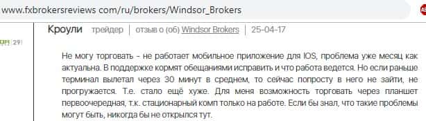 Клиент брокерской компании Windsor Brokers жалуется на интернет-портале fxbrokersreviews com на невозможность осуществлять трейдинг на рынке Форекс с помощью мобильных приложений, а также нестабильную работу торгового терминала.