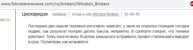 Еще одна жалоба на интернет-ресурсе fxbrokersreviews com на неудовлетворительную работу торгового терминала на сайте компании Windsor Brokers, в результате чего клиент потерял определенную сумму денег.
