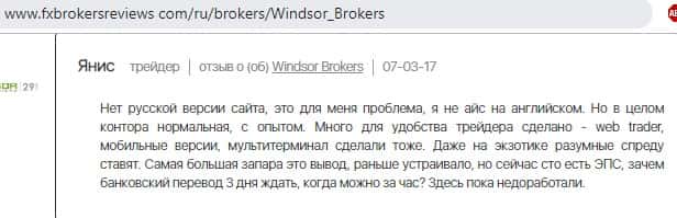Клиента брокерской компании Windsor Brokers не устраивает медленная система вывода денежных средств и отсутствие русскоязычной поддержки на сайте брокера. На это жалуется форекс трейдер на странице интернет портала fxbrokersreviews com.