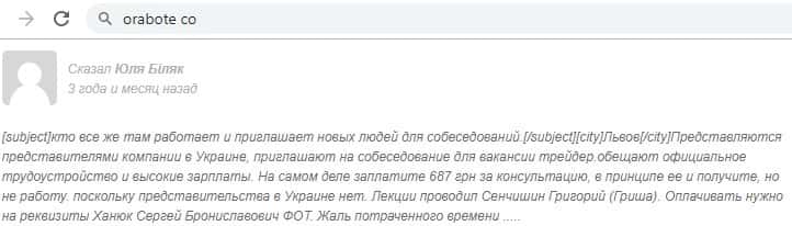 Некая Юля Бiляк рассказывает на интернет-ресурсе orabote co о том, как в брокерской компании Windsor Brokers ей обещали работу и высокую зарплату, вынудили заплатить немалые денежные средства за консультацию и обучение, а после этого попросту кинули.