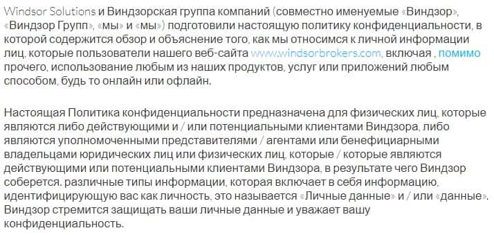 - На сайте компании Виндзор брокер windsorbrokers com опубликована Политика конфиденциальности
