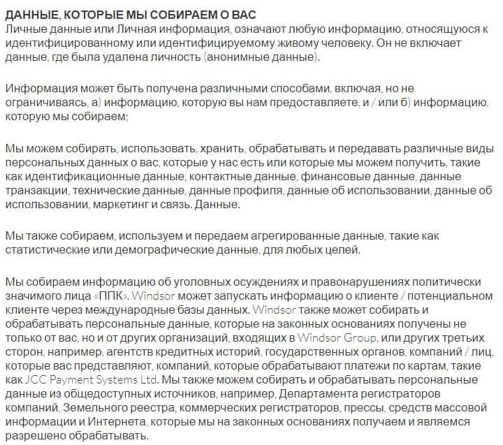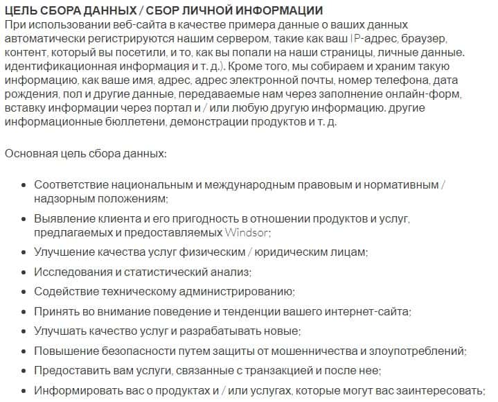 В Политике конфиденциальности, опубликованной на сайте windsorbrokers com, администрация брокерской компании Windsor Brokers подробно описывает весь перечень персональных данных клиентов, которые она планирует собирать, хранить, использовать и передавать третьим лицам.