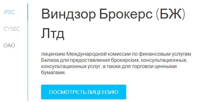 На официальном сайте брокерской компании Windsor Brokers опубликована информация о наличии у нее лицензии Международной комиссии по финансовым услугам Белиза (IFSC). Однако при нажатии на кнопку «Посмотреть лицензию» происходит переход на web-страницу, где такой лицензии не имеется.