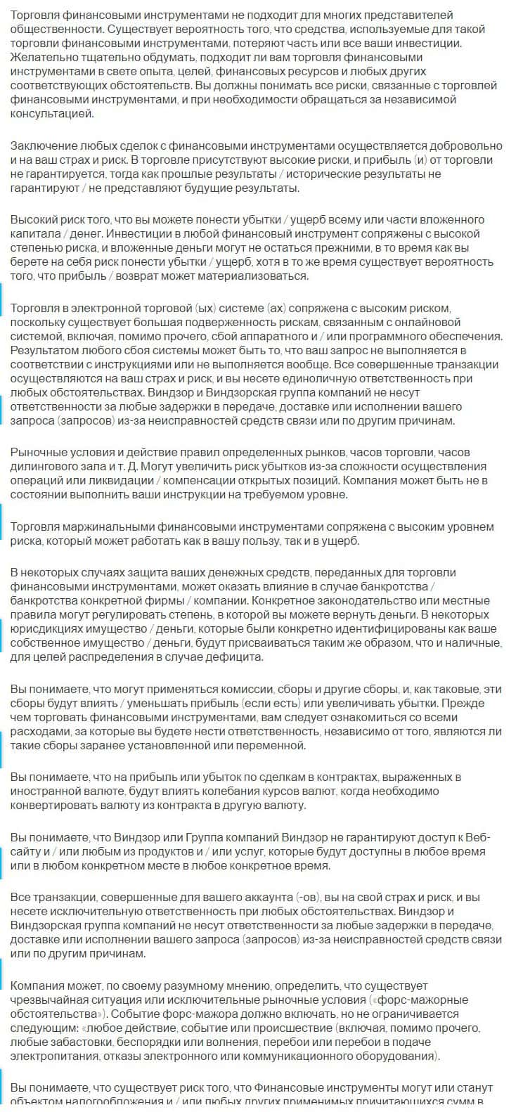 Брокерская компания Windsor Brokers на своем сайте windsorbrokers com предупреждает клиентов о финансовых рисках при сотрудничестве с ней, однако пытается всю ответственность за негативные последствия возложить на самих проигравших трейдеров, что дает ей потенциальные возможности для манипуляций.