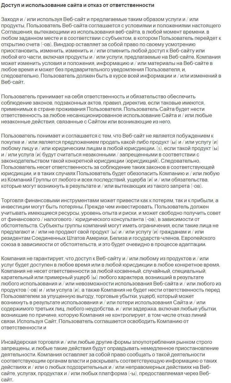 Образец Пользовательского соглашения на сотрудничество с компанией Windsor Brokers на ее сайте не приводится, однако прописаны основные принципы этого документа. В нем должны быть указаны права, обязанности и ответственность обеих сторон, причем обязанностей и ответственности у клиента больше, а приоритет в правах принадлежит Windsor Brokers